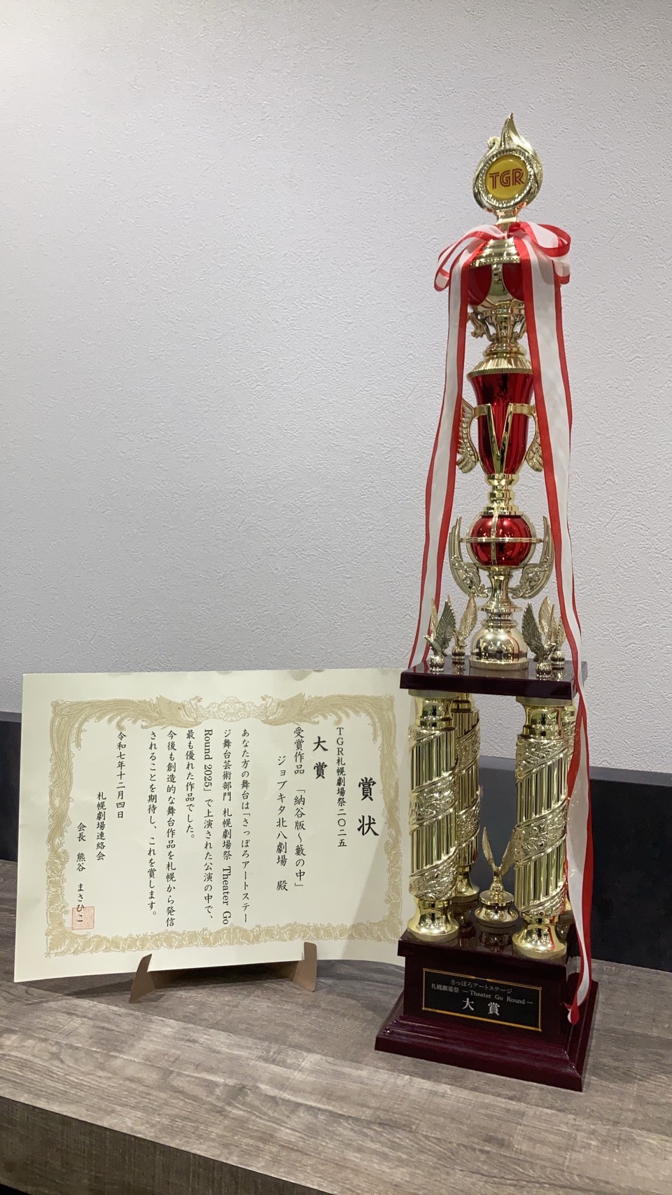 札幌劇場祭TGR2025で『納谷版~藪の中』が大賞、武山弘を演じております柴田智之が俳優賞を受賞いたしましたのでご報告いたします。本作はジョブキタ北八劇場 主催公演として2025年11月29日(土)〜12月7日(日)、12月24日(水)〜12月28日(日)(全20ステージ)で上演しております。これまで多くの方々に足を運んでいただけましたことに感謝申し上げるとともに、残りのステージも皆様にお楽しみいただける作品をお届けできるよう、関係者一同、取り組んでまいります。引き続き、どうぞ宜しくお願いいたします。